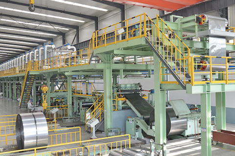 涂彩鋼板生產線年產能25萬噸,可生產規格為0.2~1.2MM*800~1250MM,生產線采用二涂二烘的輥涂工藝復合而成。基板采用本公司生產的無鋅花鍍鋅板或鍍鋁鋅硅板,具有優良的耐蝕性、力學性、外觀裝飾性,應用于建筑、家電等新興領域。